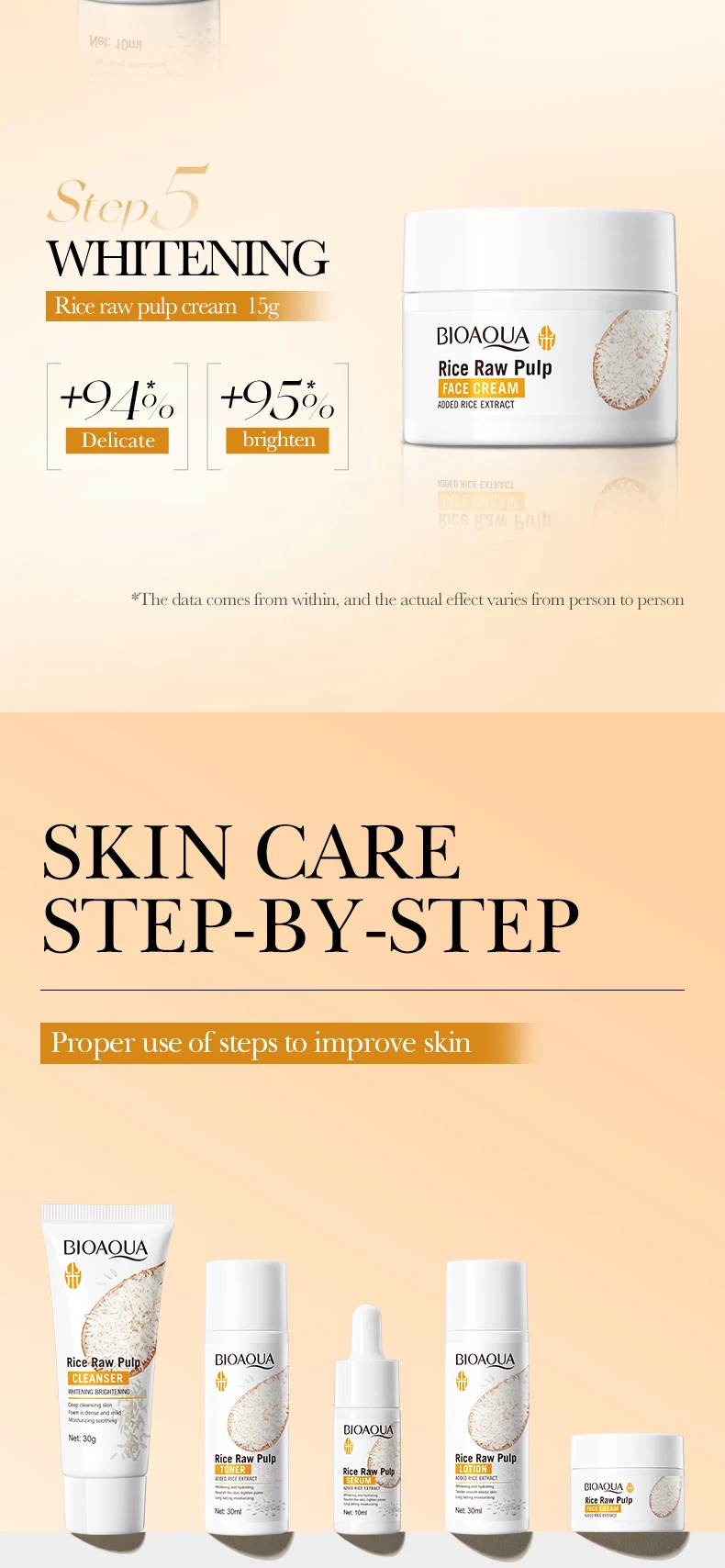 O Kit Bioaqua Rice Raw Pulp Whitening traz 5 passos essenciais para uma rotina de skincare completa, com a força nutritiva do extrato de arroz. Ele hidrata, uniformiza o tom da pele e proporciona luminosidade natural, ajudando a reduzir manchas e sinais de cansaço.